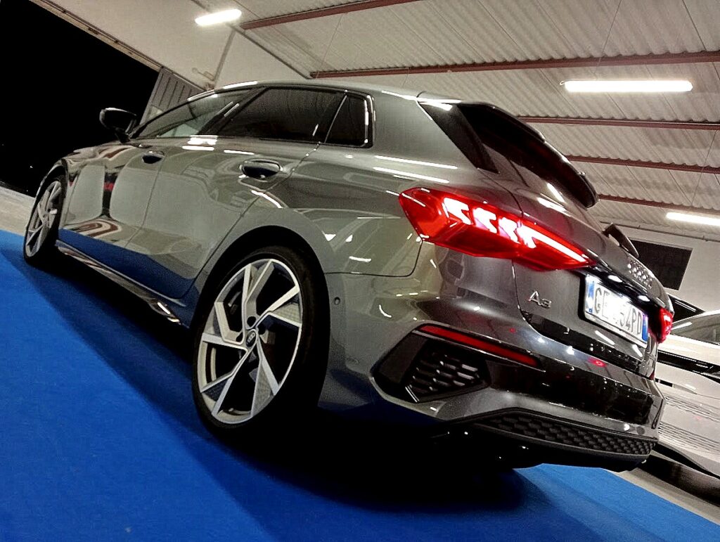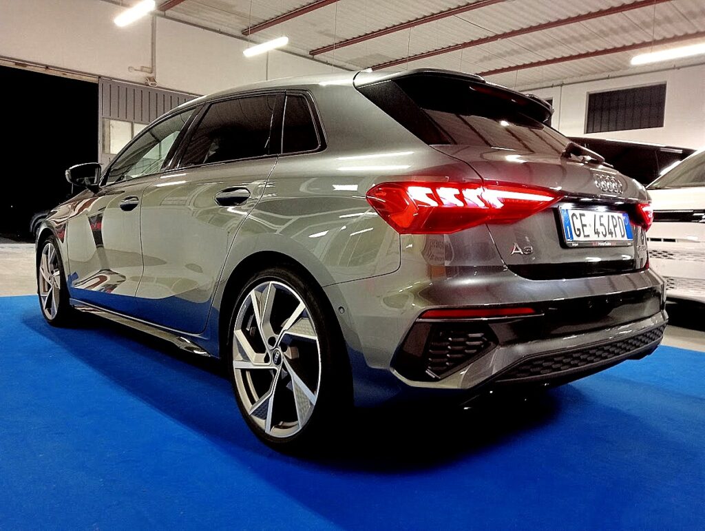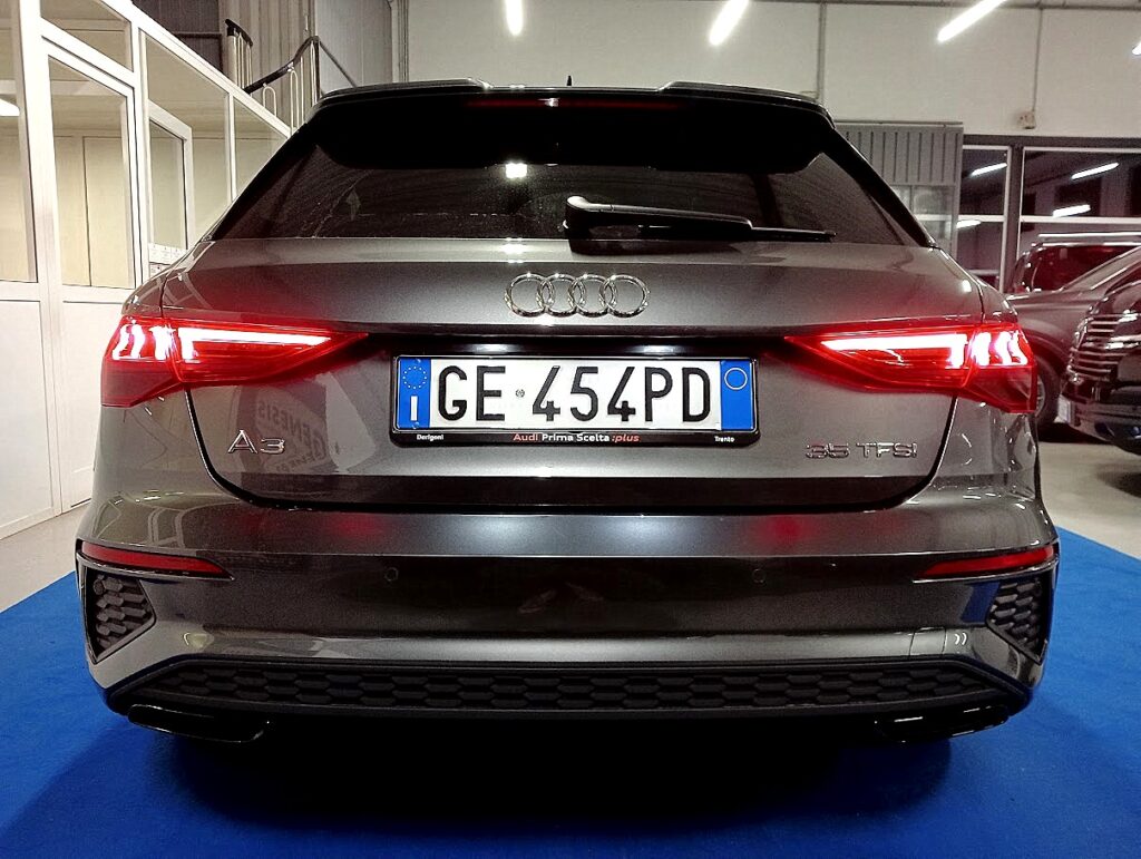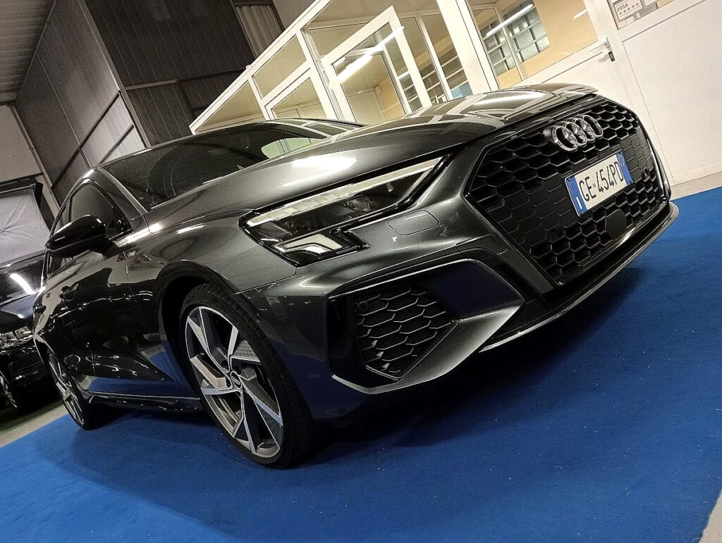 VERSIONE AUDI A3 SPORTBACK 35 1.5 TFSI 150CV SLINE PLUS STRONIC , VERNICE GRIGIO DAYTONA MET, INTERNI SLINE PELLE/STOFFA SLINE NERO IN AMBIENTE NERO, CAMBIO AUTOMATICO, EURO6D, AGEVOLABILE LEGGE 104 AL 4%