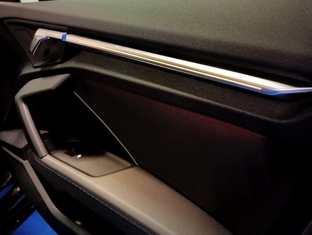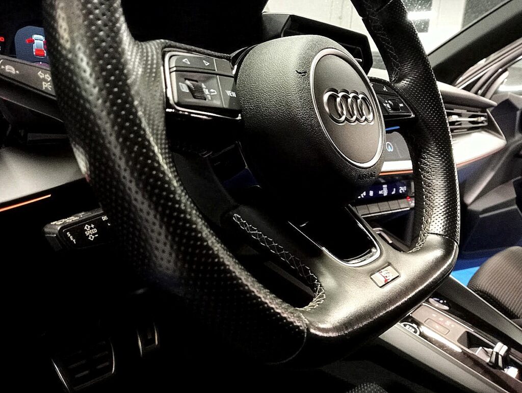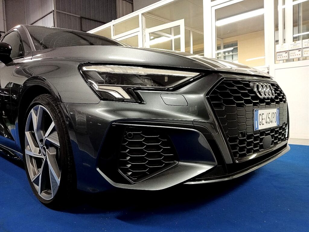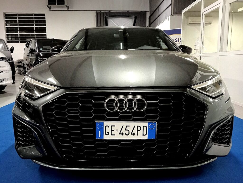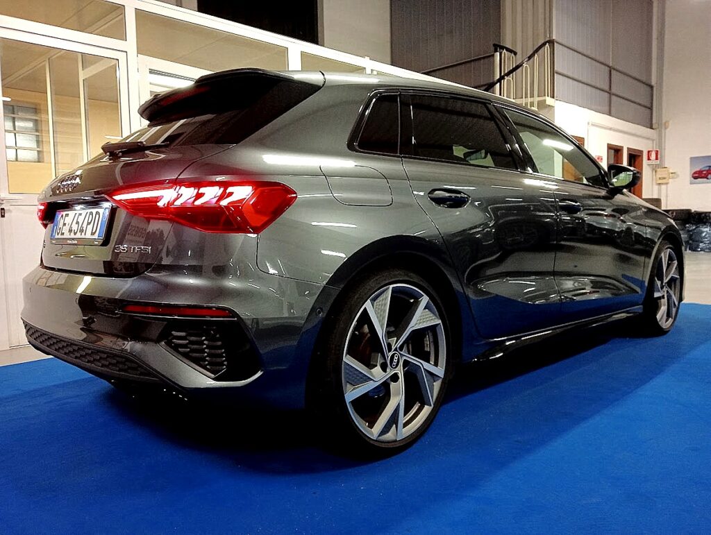 VERSIONE AUDI A3 SPORTBACK 35 1.5 TFSI 150CV SLINE PLUS STRONIC , VERNICE GRIGIO DAYTONA MET, INTERNI SLINE PELLE/STOFFA SLINE NERO IN AMBIENTE NERO, CAMBIO AUTOMATICO, EURO6D, AGEVOLABILE LEGGE 104 AL 4%